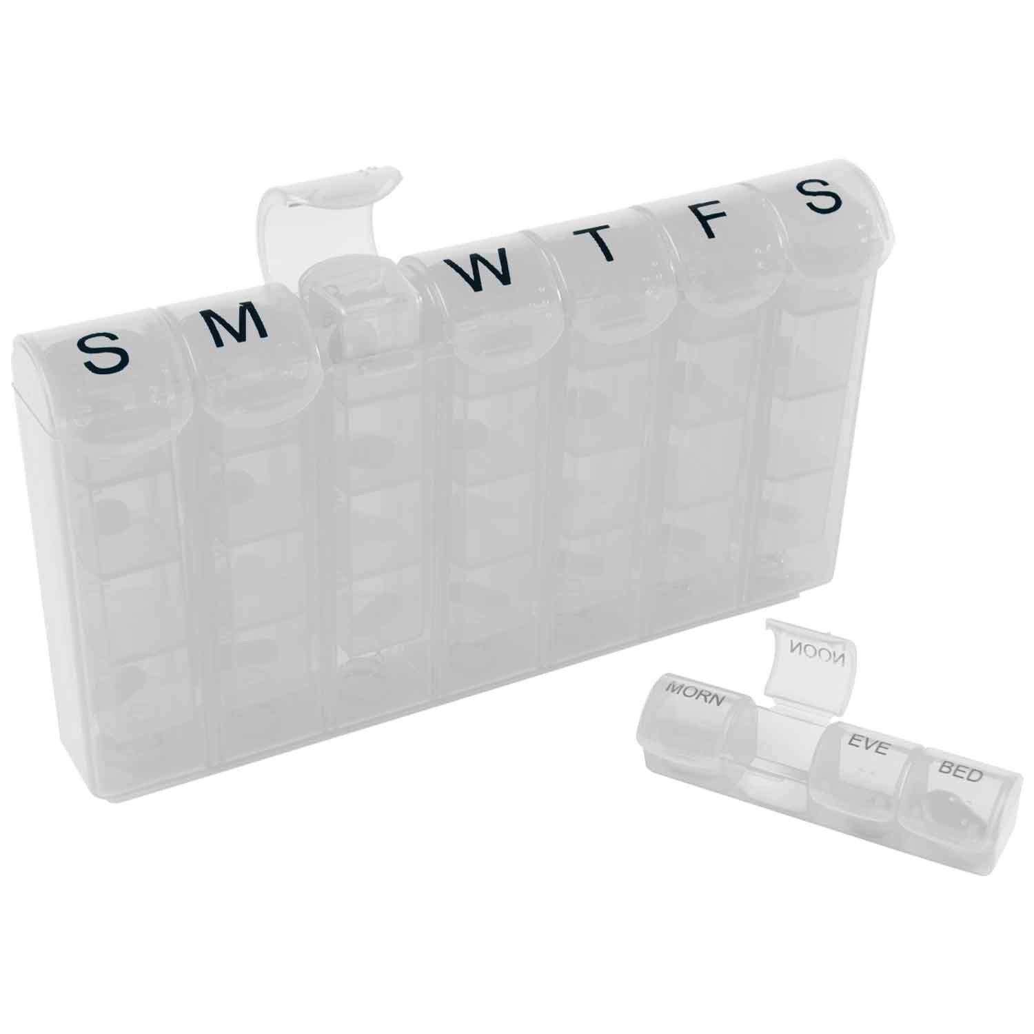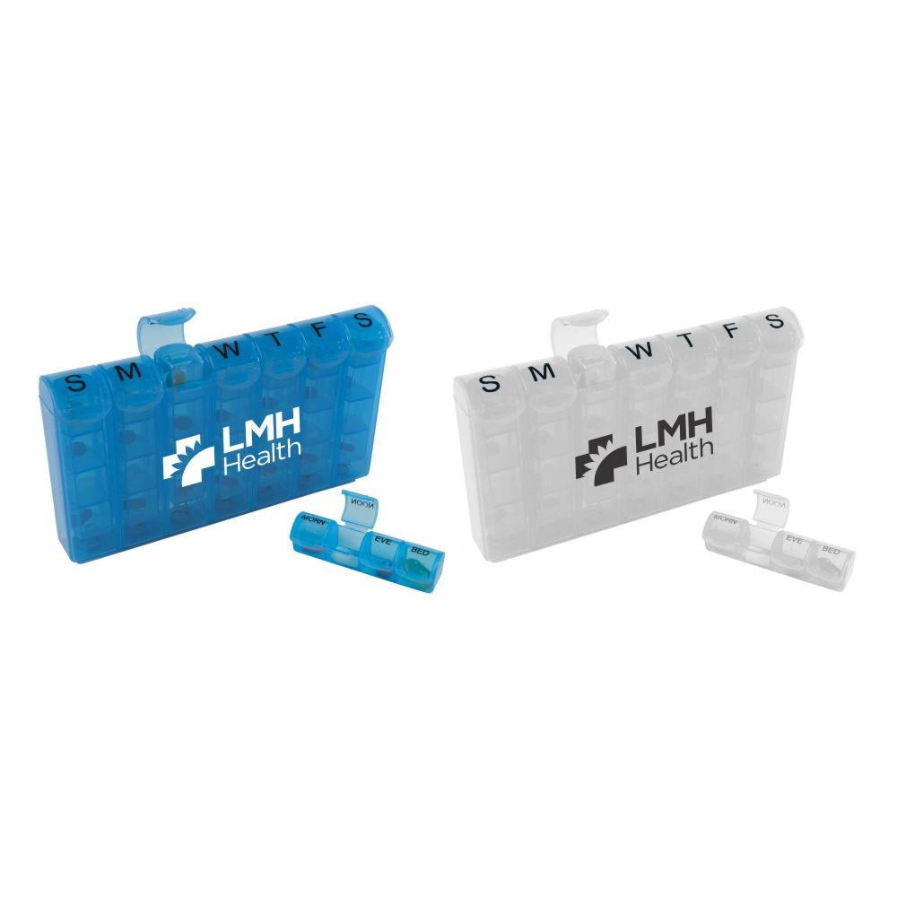 These transparent med minder holds 7 daily 4-compartment pill strips labeled for easy identification. The removable strip contains a medicine compartment for morning, noon, evening and bedtime. The stand-up design is perfect for countertops and shows off a wide imprint area. Comes in your choice of translucent blue, translucent white, or rainbow. Includes the imprint of one of the listed LMH family of logos.